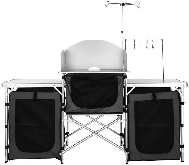 VEVOR Camping Kitchen Table, Folding Outdoor Cooking Table with Storage Carrying Bag, Aluminum Cook Station 3 Cupboard & Detachable Windscreen, Quick Set-up for Picnics, BBQ, RV Traveling, Black