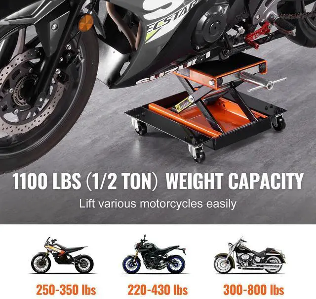 VEVOR Motorcycle Lift, 1100 LBS Motorcycle Lift ATV Scissor Lift Jack with Dolly & Hand Crank, Center Hoist Crank Stand with Wide Deck & Tool Tray for Street Bikes, Cruiser Bikes, Touring Motorcycles