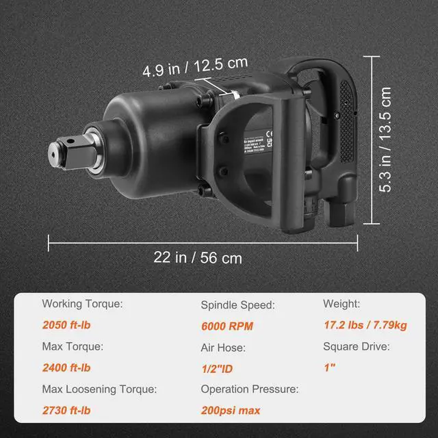 Spindle Speed: 6000 RPM,Square Drive: 1",Max Torque: 2400 ft-lb,Operation Pressure: Max. 200PSI,Air Hose: 1/2"ID,Max Loosening Torque: 2730 ft-lb,Working Torque: 2050 ft-lb,Main Material: Aluminum