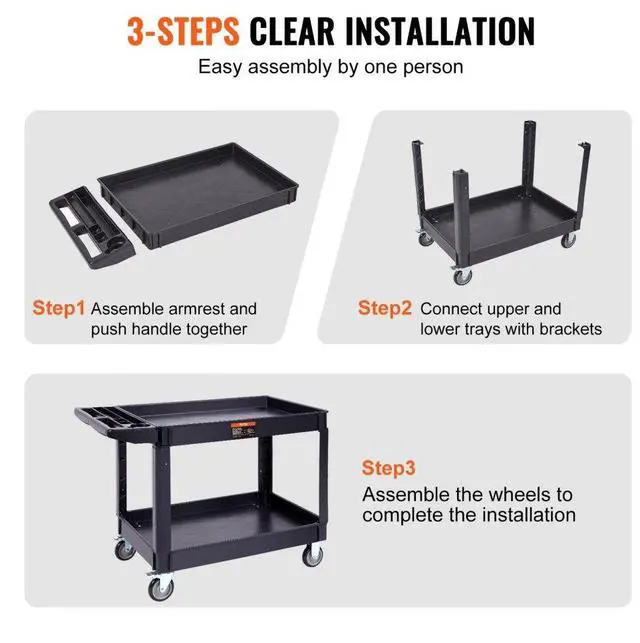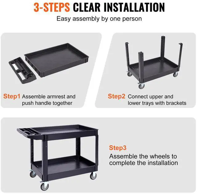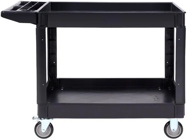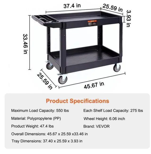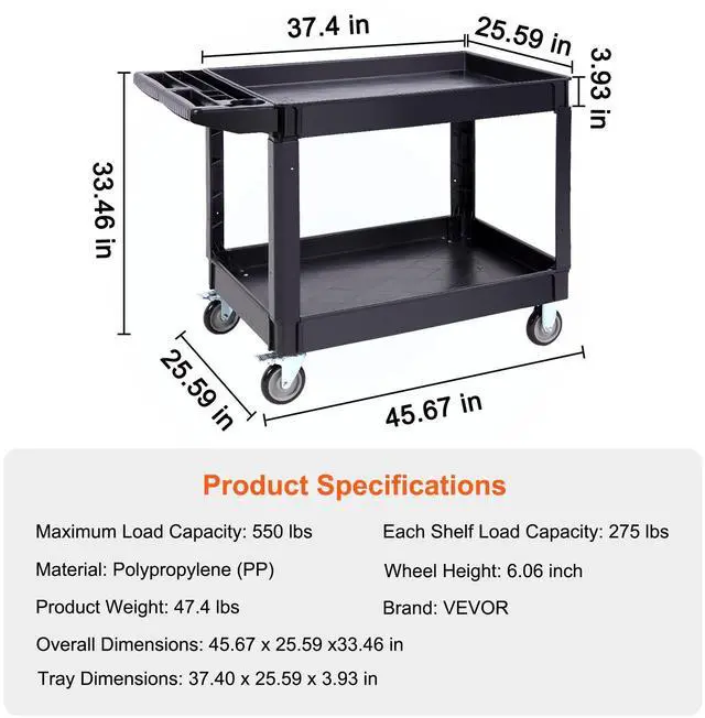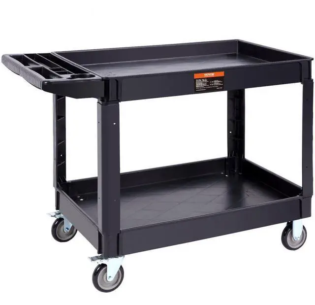 VEVOR Utility Service Cart, 2 Shelf 550LBS Heavy Duty Plastic Rolling Utility Cart with 360° Swivel Wheels (2 with Brakes), Large Lipped Shelf, Ergonomic Storage Handle for Warehouse/Garage/Cleaning