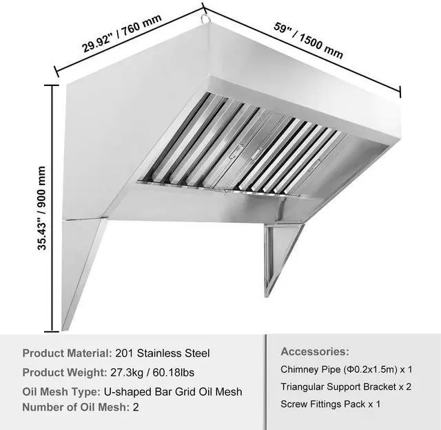Product Material: 201 Stainless Steel,Oil Mesh Dimension: 24.5"x19.5"x1.9" / 625 x 495 x 48 mm,Product Dimension: 59 x 29.92 x 35.43" / 1500 x 760 x 900mm,Triangular Bracket Dimension: 15.35 x 9.84 x 1.18" / 390 x 250 x 30mm,Product Weight: 60.18lbs / 27.3kg,Number of Oil Mesh: 2,Oil Mesh Type: U-shaped Bar Grid Oil Mesh
