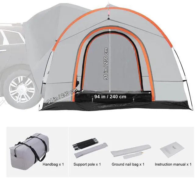 Applicable Position: Rear of SUV,Tent Structure: Double-layer Tent,Waterproof Grade: PU2000 mm,Internal Dimensions (L x W x H): 94 × 94 × 91 in / 240 × 240 × 230 cm,Color: Gray+White,Item Model Number: TBT-8080,Item Weight: 18 lbs / 8.1 kg,Package Size: 29×12×8 in / 70×30×21 cm