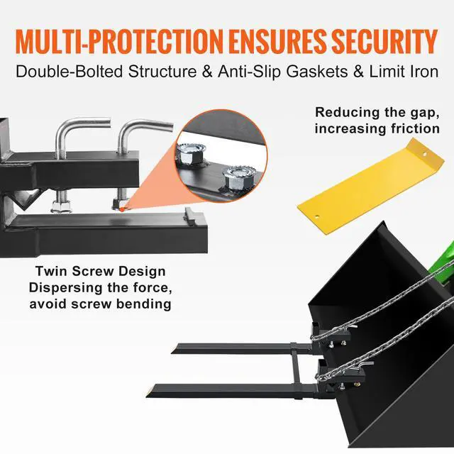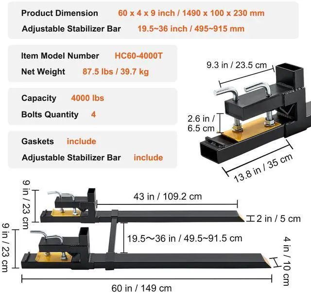 Accessories: 1 x Manual,Bucket Lip-below: C=13.8 in / 350 mm, Rectangular Tube: 2 x 4 x 0.16t in / 50 x 100 x t4 mm,Capacity: 4000 lbs / 1814 kg,Fork Length: L1 x H1=43 x 2 in / 1090 x 50 mm,Item Model Number: HC60-4000T,Bucket Lip Gap: A=2.6 in / 65 mm, Rectangular Tube: 2 x 4 x 0.16t in / 50 x 100 x t4 mm,Inner Tube Size: 1.2 x 1.2 in / 30 x 30 mm,Outer Tube Size: 1.6 x 1.6 in / 40 x 40 mm,Bucket Lip-above: B=9.3 in / 235 mm, Rectangular Tube: 2 x 4 x 0.16t in / 50 x 100 x t4 mm,Product Dimensions: 58.7 x 4 x 9 in / 1490 x 100 x 230 mm,Net Weight: 87.5 lbs / 39.7 kg ± 2%,Adjustable Stabilizer Bar: 19.5-36 in / 495-915 mm