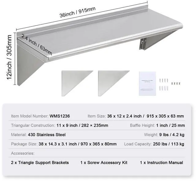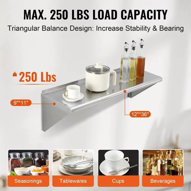 VEVOR 12" x 36" Stainless Steel Shelf, Wall Mounted Floating Shelving with Brackets, 250 lbs Load Capacity Commercial Shelves, Heavy Duty Storage Rack for Restaurant, Kitchen, Bar, Home, and Hotel