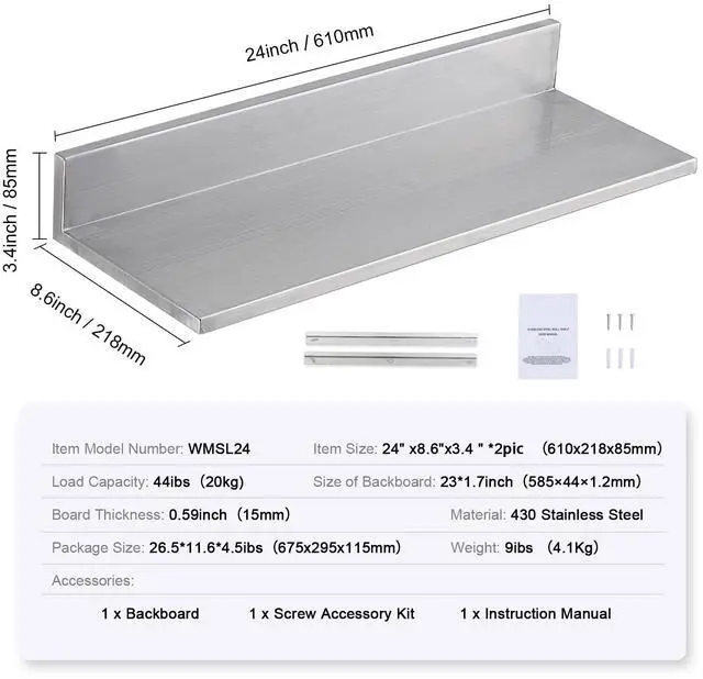 Backsplash Size: 23x1.7 inch / 735×44 mm,Item Size: 24x8.6x3.4 inch / 610x218x85 mm,Load Capacity: 44 lbs / 20 kg,Item Model Number: WMSL24,Material: 430 Stainless Steel,Baffle Height: 0.59 inch / 15 mm,Weight: 9 lbs / 4.1 kg