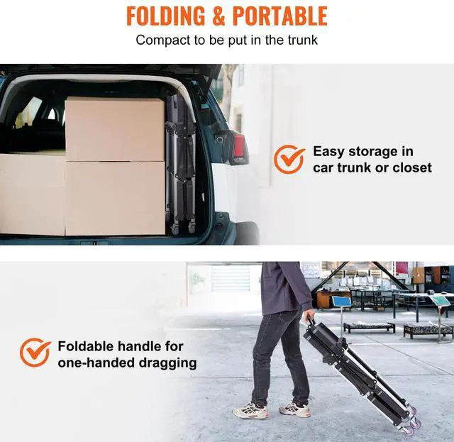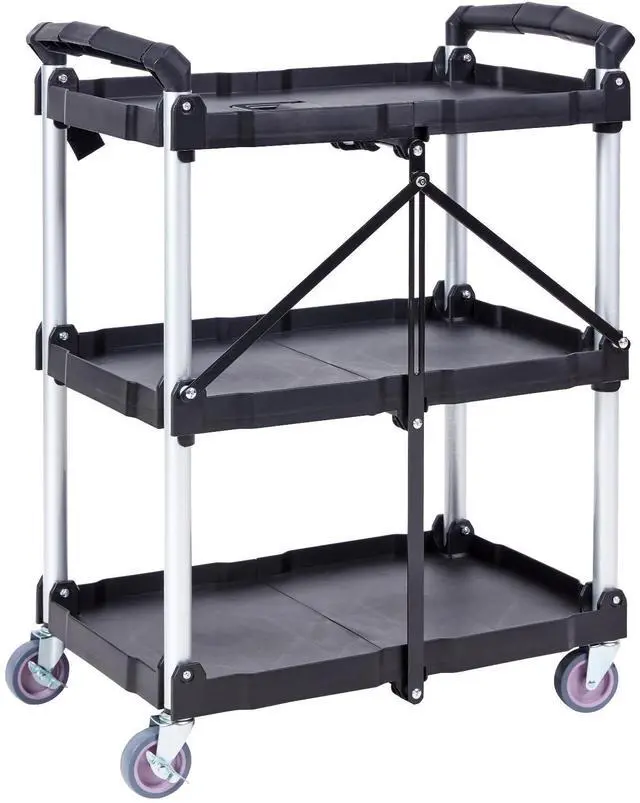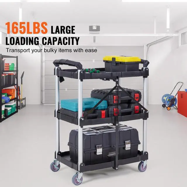 VEVOR Foldable Utility Service Cart, 3 Shelf 165LBS Heavy Duty Plastic Rolling Cart with Lockable Wheels, Ergonomic Handle, Portable Garage Tool Cart for Warehouse/Office/Home(25.62"x15.43"x32.76")