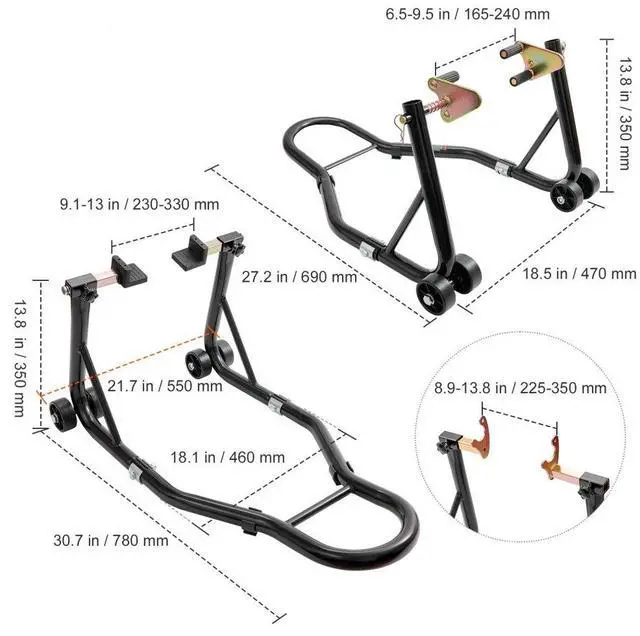 Front Stand Size: 18.5×27.2×13.6 inch/470×690×345 mm,Rear Stand Size: 21.7×30.7×14.4 inch/550×780×365 mm,Item Model Number: TD-003-05FR,Adjustable Width: U Type: 8.9-13.8 in/225-350 mm; L Type: 9.1-13 in/230-330 mm; Double Fork Heads: 6.5-9.5 in/165-240 mm,Max. Capacity: 850 lbs/0.39 tons,Adapter Types: Front Wheel: Double Fork Heads; Rear Wheel: U+L Fork Head,Net Weight: 19.8 lbs/9 kg