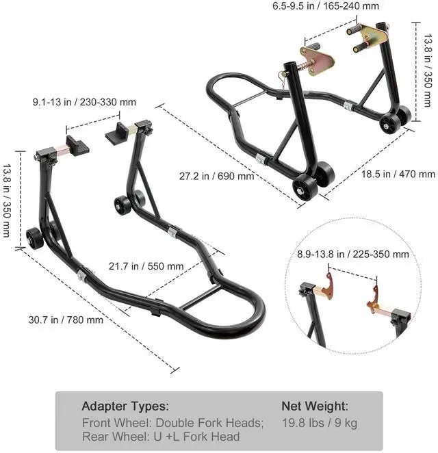 Front Stand Size: 18.5×27.2×13.6 inch/470×690×345 mm,Rear Stand Size: 21.7×30.7×14.4 inch/550×780×365 mm,Item Model Number: TD-003-05FR,Adjustable Width: U Type: 8.9-13.8 in/225-350 mm; L Type: 9.1-13 in/230-330 mm; Double Fork Heads: 6.5-9.5 in/165-240 mm,Max. Capacity: 850 lbs/0.39 tons,Adapter Types: Front Wheel: Double Fork Heads; Rear Wheel: U+L Fork Head,Net Weight: 19.8 lbs/9 kg