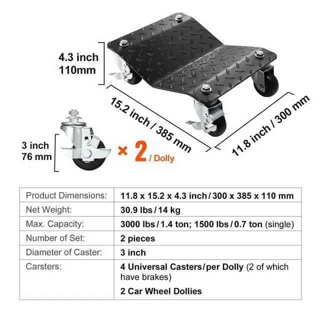 Adaptable Tire Width: 0-12 inch/0-305 mm,Diameter of Caster: 3 inch,Item Model Number: XJC-080-2,Max. Capacity: 3000 lbs/1.4 ton; 1500 lbs/0.7 ton (single),Product Dimensions: 11.8 x 15.2 x 4.3 inch/300 x 385 x 110 mm,Net Weight: 30.9 lbs/14 kg,Number of Set: 2 pieces