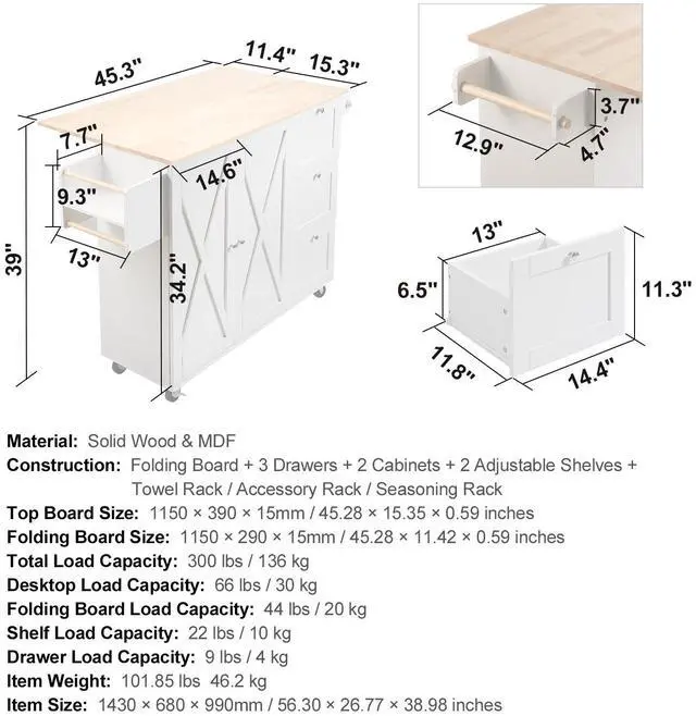 Top Board Size: 45.28x15.35x0.59 inch / 1150x390x15 mm,Drawer Load Capacity: 9 lbs / 4 kg,Item Size: 56.30x26.77x38.98 inch / 1430x680x990 mm,Color: White,Item Model Number: SR221265,Shelf Load Capacity: 22 lbs / 10 kg,Material: Solid Wood & MDF,Total Load Capacity: 300 lbs / 136 kg,Folding Board Size: 45.28x11.42x0.59 inch / 1150x290x15 mm,Folding Board Load Capacity: 44 lbs / 20 kg,Item Weight: 101.85 lbs / 46.2 kg,Desktop Load Capacity: 66 lbs / 30 kg