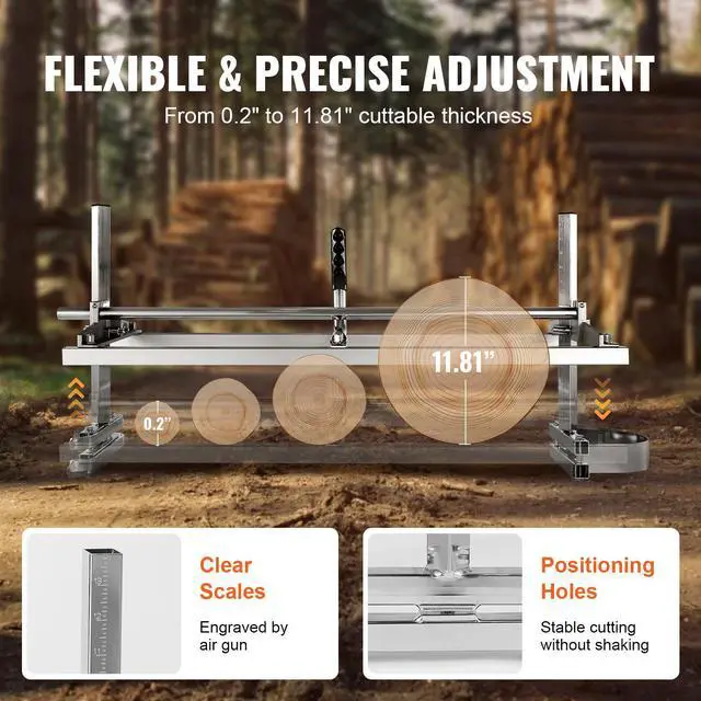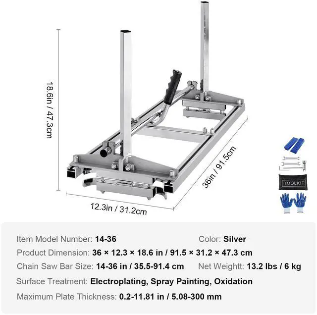 Chainsaw Mill Bar Size: 14-36 in / 355-914 mm,Product Dimension: 36 x 12.3 x 18.6 in / 915 x 312 x 473 mm,Color: Silver,Surface Treatment: Electroplating, Spray Painting, Oxidation,Net Weight: 13.2 lbs/ 6 kg,Maximum Cutting Thickness: 0.2-11.81 in / 5.08-300 mm