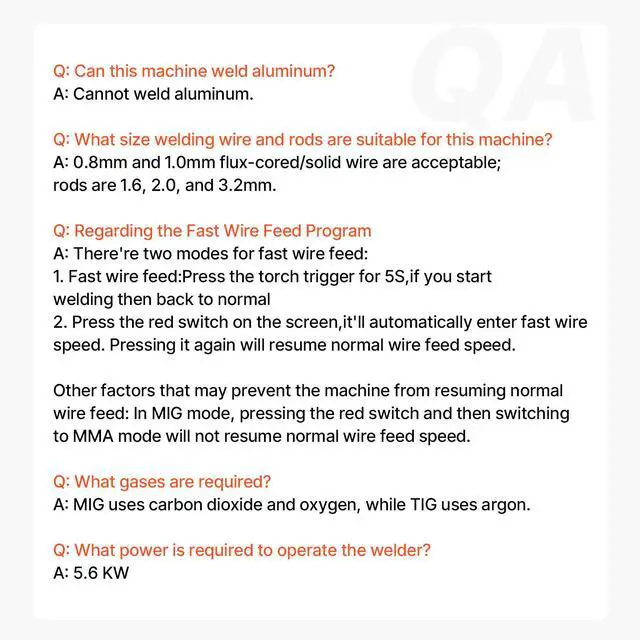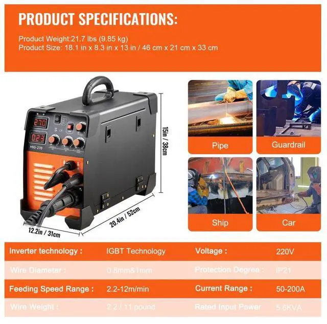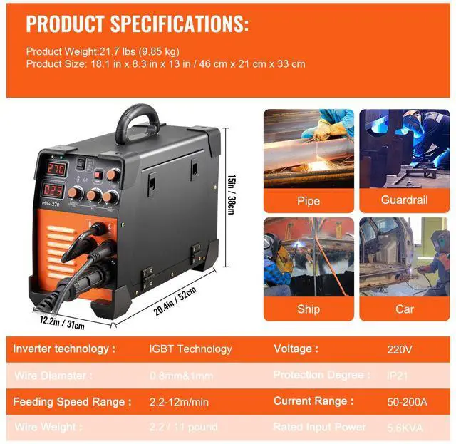 Current Range: 50-220A,Rated Input Power: 5.6KVA,Wire Weight: 2.2 /11 pounds,Voltage: 110V/220V,Model: MIG-270,Welder Type: MIG/MMA/TIG,Protection Degree: IP21S,Wire Thickness: 0.024'' & 0.031'' & 0.039'' / 0.6 mm & 0.8 mm & 1 mm,Wire Speed: 2.2-12 m/min