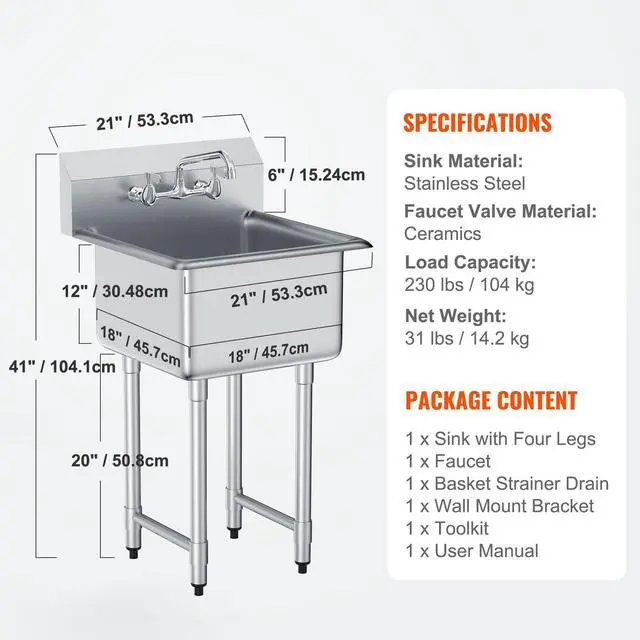 Load Capacity: 230 lbs / 104 kg,Item Size: 21x18x41 in / 533.4x457x1041 mm,Item Model Number: S1C-181812,Net Weight: 31 lbs / 14.2 kg,Sink Material: Stainless Steel,Faucet Valve Material: Ceramics
