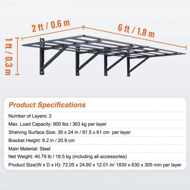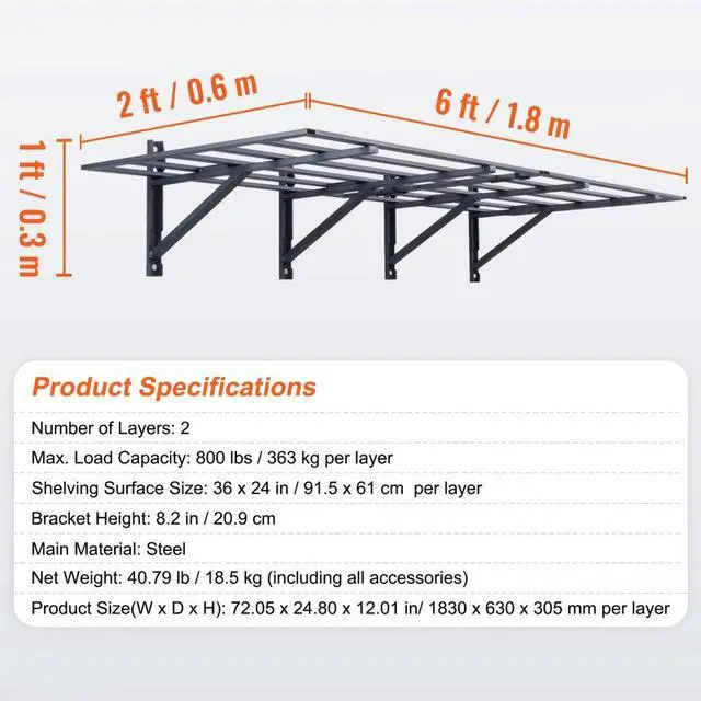Product Size(W x D x H): 72.05 x 24.8 x 12.01 in / 1830 x 630 x 305 mm(per layer),Number of Layers: 2,Item Model Number: HL2472,Max. Load Capacity: 800 lbs / 363 kg per layer,Shelving Surface Size: 6 x 2 ft / 72 x 24 in(183 x 61 cm),Bracket Height: 8.2 in / 20.9 cm,Net Weight: 40.79 lbs /18.5 kg,Main Material: Steel