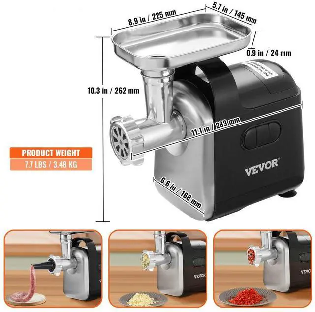 Tray Material: 304 Stainless Steel,Capacity (Minute): 6.6 lbs / 3 kg,Certifications: ETL&CE&FDA,Overall Machine Size: 10.3 x 6.6 x 11.1 in / 262 x 168 x 283 mm,Tray Load-bearing: 8.8-11 LB / 4-5 KG,Tube Collant/Head/Auger Material: Cast Aluminum,Tray Size: 8.9 x 5.7 x 0.9 inch / 225 x 145 x 24 mm,Body Material: ABS + Stainless Steel,Voltage: 110V/60Hz,Model: MG5008,Blade/Cutting Plates Material: 420 Stainless Steel,Continuous Working Time (Minute): 15,Net Weight: 7.7 lbs / 3.48 kg,Power: 550W (2200W max.)