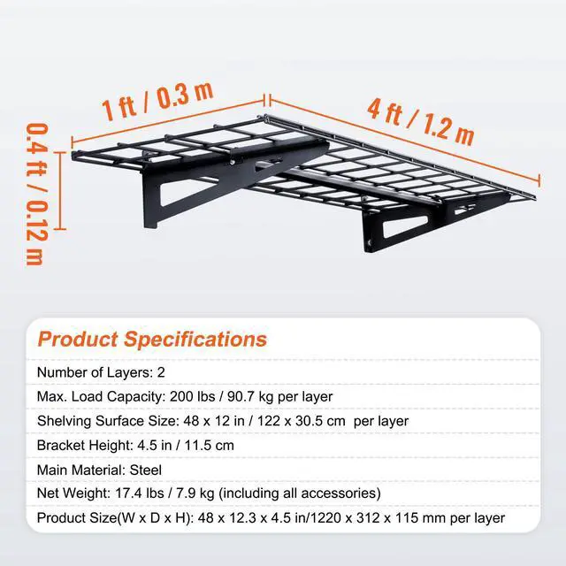 Product Size(W x D x H): 48 x 12.3 x 4.5 in / 1220 x 312 x 115 mm(per layer),Number of Layers: 2,Item Model Number: LL1248,Max. Load Capacity: 200 lbs / 90.7 kg per layer,Shelving Surface Size: 4 x 1 ft / 48 x 12 in(122 x 30.5 cm),Bracket Height: 4.5 in / 1.5 cm,Net Weight: 17.4 lbs / 7.9 kg,Main Material: Steel