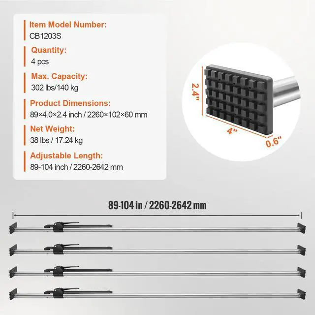 Item Model Number: CB1203S,Quantity: 4 pcs,Product Dimensions: 89.5×4.0×2.4 inch/2273×102×60 mm,Max. Capacity: 302 lbs/140 kg,Net Weight: 38 lbs/17.24 kg,Adjustable Length: 89-104 inch/2260-2642 mm