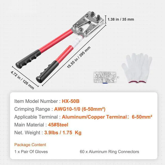 Applicable Terminal: Aluminum/Copper Terminal,Crimping Range: AWG10-1/0 (6-50mm²),Item Model Number: HX-50B,Net. Weight:3.9 lbs / 1.75 kg,Main Material: 45# Steel