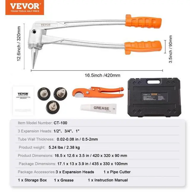 3 Expansion Heads: 1/2", 3/4", 1",Tube Wall Thickness: 0.02-0.08 in / 0.5-2mm,Product weight: 5.24 lbs / 2.38 kg,Package Dimensions: 17.1 x 13 x 3.9 in / 435 x 330 x 100mm,Item Model Number: CT-100,Product Dimensions: 16.5 x 12.6 x 3.5 in / 420 x 320 x 90 mm