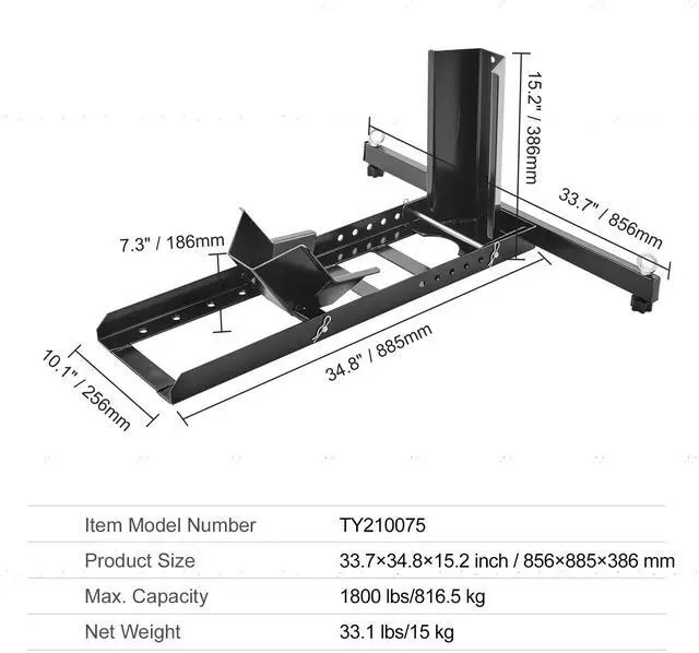 Compatible Tire Width:3-8 inch/76.2-203.2 mm,Item Model Number: TY210075,Compatible Hub Diameter:15-22 inch/381-558.8 mm,Max. Capacity:1800lbs/816.5 kg,Net Weight:33.1lbs/15 kg,Product Size:33.7×33.8×16.5 inch/855×860×420 mm