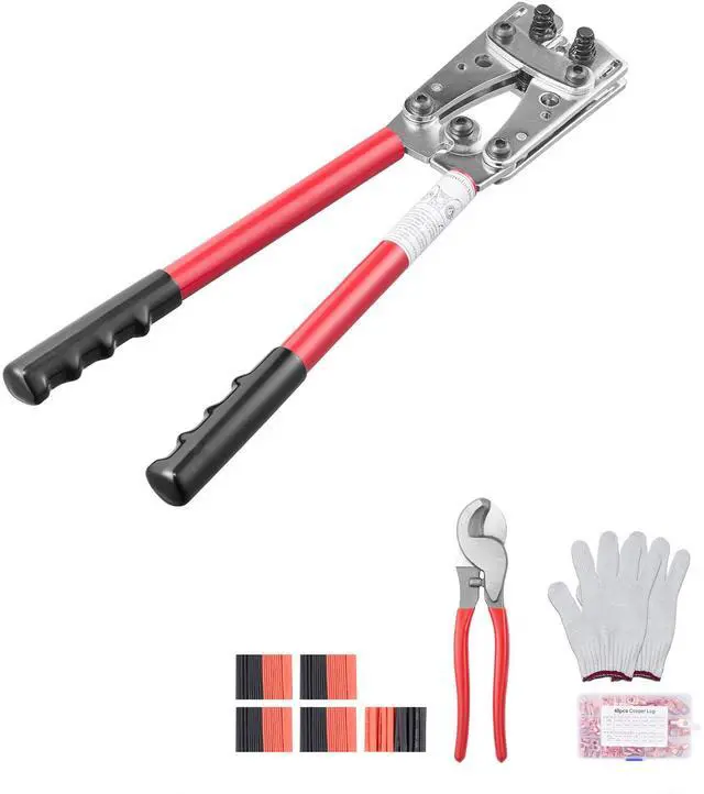 VEVOR Crimping Tool, AWG10-1/0 Copper And Aluminum Terminal Battery Lug Crimper, 6 Wire Sizes Crimping Die, with a Cutting Pliers, Gloves, 95pcs Copper Ring Connectors, and 100pcs Heat Shrink Tubes