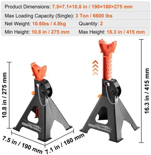 Max Height:16.3 in/415 mm,Capacity per Stand: 3 Ton/6600 lbs,Quantity: 2,Material: Steel,Min Height: 10.8 in/275 mm,Product Dimensions: 7.5×7.1×10.8 in/190×180×275 mm,Weight: 10.6lbs/4.8 kg