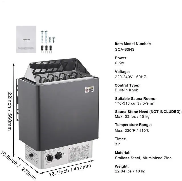 Timer: 3 h,Control Type: Built-in Knob,Sauna Stone Need (NOT INCLUDED): Max. 33 lbs / 15 kg,Voltage: 220-240VAC 60HZ,Item Model Number: SCA-60NS,Temperature Range: Max. 230 / 110,Material: Stailess Steel, Aluminized Zinc,Item Dimensions: 16.1'' x 10.6'' x 22'' / 410 x 270 x 560 mm,Suitable Sauna Room: 176-318 cu.ft / 5-9 m³,Power: 6 Kw,Item Weight: 22.04 lbs / 10 kg