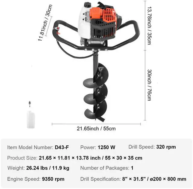 Engine speed: 9350RPM,Item Model Number: D43-F,Drill speed: 320RPM,Drill specification: 8(ø200*800mm),Displacement: 43CC,Power: 1250W