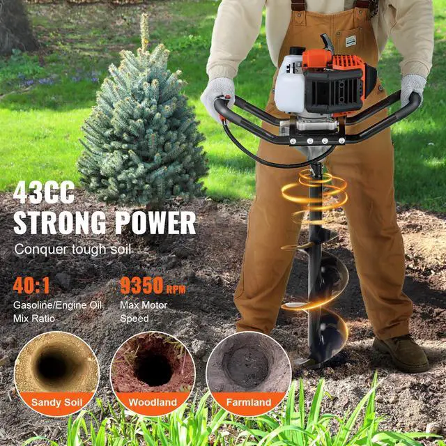 VEVOR Post Hole Digger, 43cc 1250W Auger Post Hole digger, Gas Powered Earth Digger with 8" Earth Auger Drill Bit, 30 inch Long Alloy Steel Auger, for Farmland, Garden and Plant, EPA certification