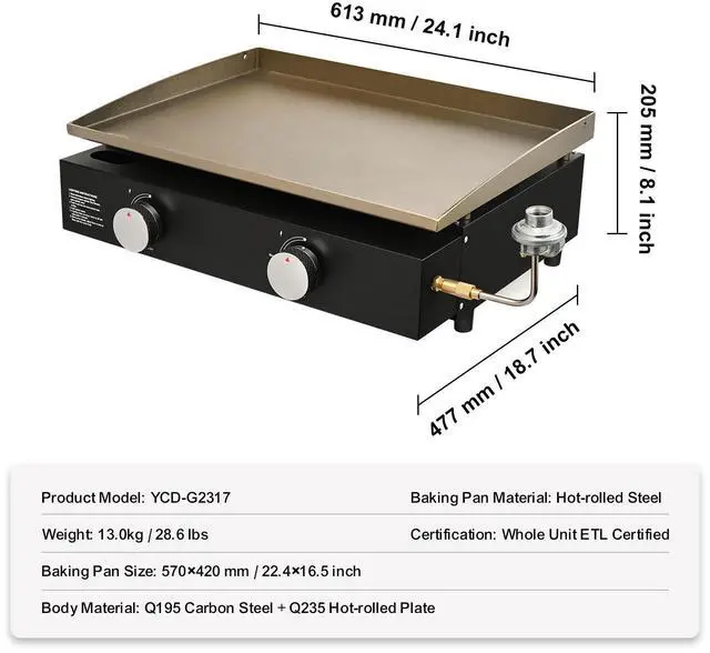 Body Material: Q195 Carbon Steel + Q235 Hot-rolled Plate,Baking Pan Material: Hot-rolled Steel,Item Size: 613x477x205 mm / 24.1x18.7x8.1 inch,Item Model Number: YCD-G2317,Baking Pan Size: 570x420 mm / 22.4x16.5 inch,Weight: 13 kg / 28.6 lbs,Certification: Whole Unit ETL Certified