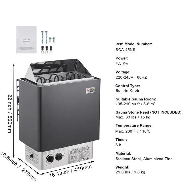 Timer: 3 h,Control Type: Built-in Knob,Sauna Stone Need (NOT INCLUDED): Max. 33 lbs / 15 kg,Voltage: 220-240VAC 60HZ,Item Model Number: SCA-45NS,Temperature Range: Max. 230 / 110,Material: Stailess Steel, Aluminized Zinc,Item Dimensions: 16.1'' x 10.6'' x 22'' / 410 x 270 x 560 mm,Suitable Sauna Room: 105-210 cu.ft / 3-6 m³,Power: 4.5 Kw,Item Weight: 21.6 lbs / 9.8 kg