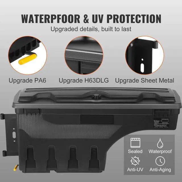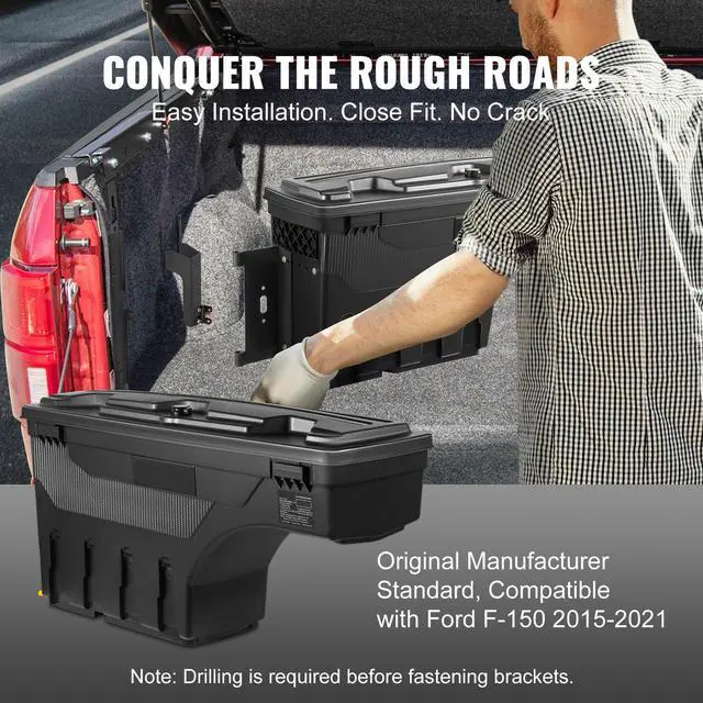 Compatible with: Ford F-150 2015-2021 L,Max Load: 75 lbs/34 kg,Max Capacity: 6.6 Gal/25 L,Color: Black (matte),Product Weight: 11 lbs/5 kg (Net); 19.8 lbs/9.0 kg (Gross),Main Material: ABS & Carbon Steel,Package Size: 36.4x11x16.7 in/925x280x425 mm