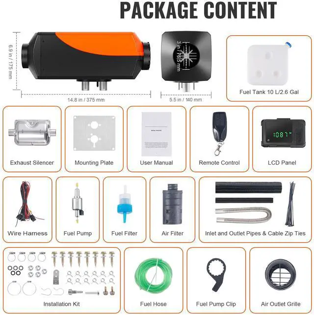 BTU: 215-269 ft²/20-25 m²,Operating Consumption: 12V/3A,Fuel Tank Volume: 10 L/2.6 Gal,Control Method: LCD+Remote Control+Bluetooth APP,Adjustable Temperature Range: 46-96.8/8-36,Product Size: 14.8×5.5×6.9 inch/375×140×175 mm,Fuel Consumption: 0.16-0.62 L/H,Working Temperature: -104-104/-40-40,Item Model Number: XMZ-D2,Applicable Altitude: Below 5500 m/18045 ft,Air Outlet Pipe Inner Diameter:3 in/76.5 mm,Heating Power: 8 KW,Net Weight: 13.6 lbs/6.15 kg