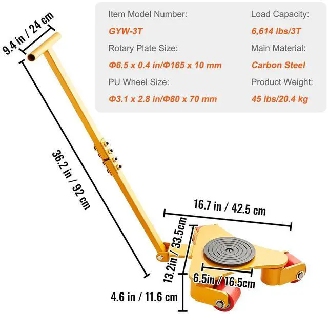 Dolly Size: 16.7 x 13.2 x 4.6 in/ 425 x 335 x 116 mm,Load Capacity: 6614 LBS/3T,Rotary Plate Size: 6.5 x 0.4 in/ 165 x 10 mm,Item Model Number: GYW-3T,Product Weight: 45 lbs/20.4 kg,PU Wheel Size: 3.1 x 2.8 in/ 80 x 70 mm,Main Material: Carbon Steel