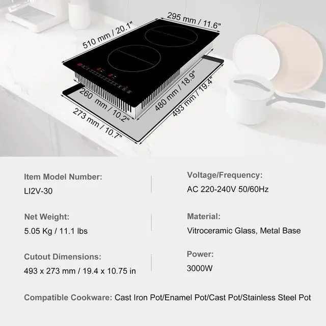 Voltage/Frequency: AC 220-240V 50/60Hz,Model: LI2V-30,Compatible Cookware: Iron Pot/Cast Iron Pot/Stainless Steel Pot,Material: Vitroceramic Glass, Metal Casing,Net Weight: 5.05 Kg / 11.1 lbs,Power: 3000W,Gear Position: 9