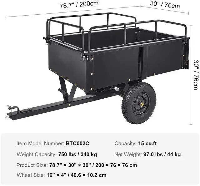 Wheel Size: 16" x 4" / 40.6 x 10.2 cm,Weight Capacity: 750 lbs / 340 kg,Capacity: 15 cu.ft,Color: Black,Item Model Number: BTC002C,Net Weight: 97.0 lbs / 44 kg,Main Material: Iron,Product Size: 78.7" x 26" x 29.9" / 200 x 66 x 76 cm
