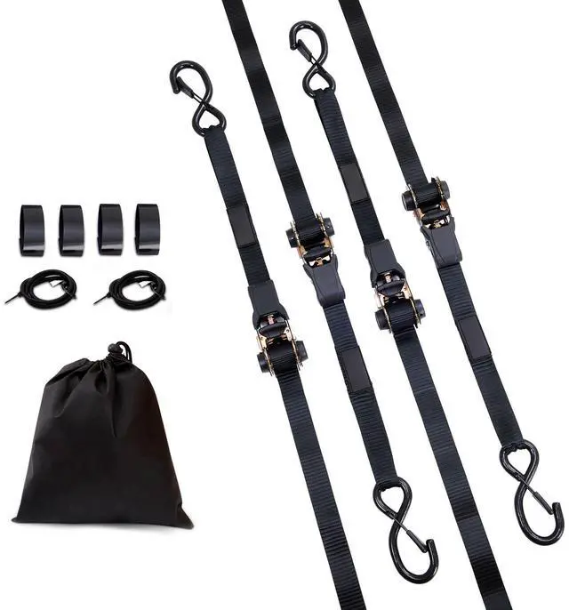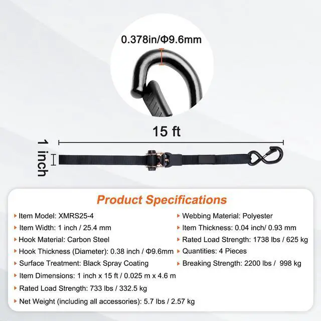 Rated Load Strength: 733 lbs / 332.5 kg,Item Model: XMRS25-4,Item Thickness: 0.04 inch/ 0.93 mm,Hook Material: Carbon Steel,Net Weight (including all accessories): 5.7 lbs / 2.57 kg,Breaking Strength: 2200 lbs / 998 kg,Surface Treatment: Black Spray Coating,Hook Thickness (Diameter): 0.38 inch / 9.6 mm,Item Dimensions: 1 inch x 15 ft / 0.025 m x 4.6 m,Quantities: 4 Pieces,Item Width: 1 inch / 25.4 mm,Webbing Material: Polyester