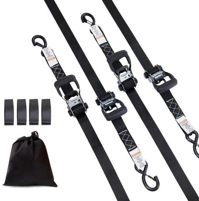 Rated Load Strength: 1738 lbs / 788 kg,Item Model: XMRS38-4,Item Thickness: 0.05 inch/ 1.36 mm,Hook Material: Carbon Steel 45#,Net Weight (including all accessories): 9.5 lbs / 4.3 kg,Breaking Strength: 5208 lbs / 2362 kg,Surface Treatment: Black Spray Coating,Hook Thickness (Diameter): 0.5 inch / 13 mm,Item Dimensions: 1.6 inch x 8 ft / 0.04 m x 2.4 m,Quantities: 4 Pieces,Item Width: 1.6 inch / 40.64 mm,Webbing Material: Polyester