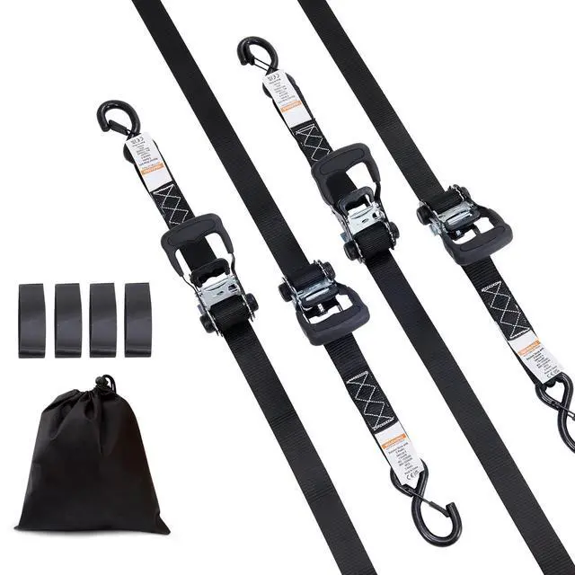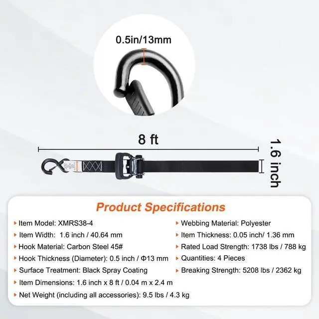 Rated Load Strength: 1738 lbs / 788 kg,Item Model: XMRS38-4,Item Thickness: 0.05 inch/ 1.36 mm,Hook Material: Carbon Steel 45#,Net Weight (including all accessories): 9.5 lbs / 4.3 kg,Breaking Strength: 5208 lbs / 2362 kg,Surface Treatment: Black Spray Coating,Hook Thickness (Diameter): 0.5 inch / 13 mm,Item Dimensions: 1.6 inch x 8 ft / 0.04 m x 2.4 m,Quantities: 4 Pieces,Item Width: 1.6 inch / 40.64 mm,Webbing Material: Polyester