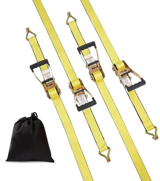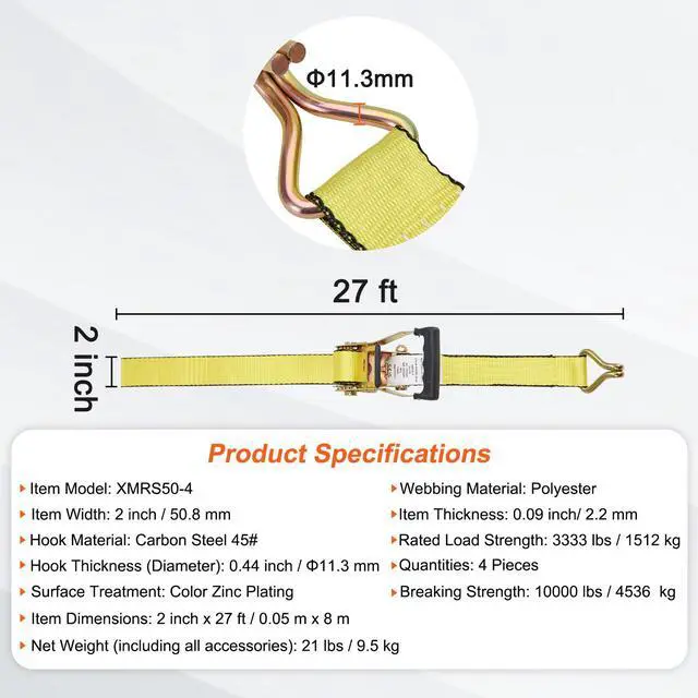 Rated Load Strength: 3333 lbs / 1512 kg,Item Model: XMRS50-4,Item Thickness: 0.09 inch/ 2.2 mm,Hook Material: Carbon Steel 45#,Net Weight (including all accessories): 21 lbs / 9.5 kg,Breaking Strength: 10000 lbs / 4536 kg,Surface Treatment: Color Zinc Plating,Hook Thickness (Diameter): 0.44 inch / 11.3 mm,Item Dimensions: 2 inch x 27 ft / 0.05 m x 8 m,Quantities: 4 Pieces,Item Width: 2 inch / 50.8 mm,Webbing Material: Polyester