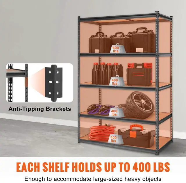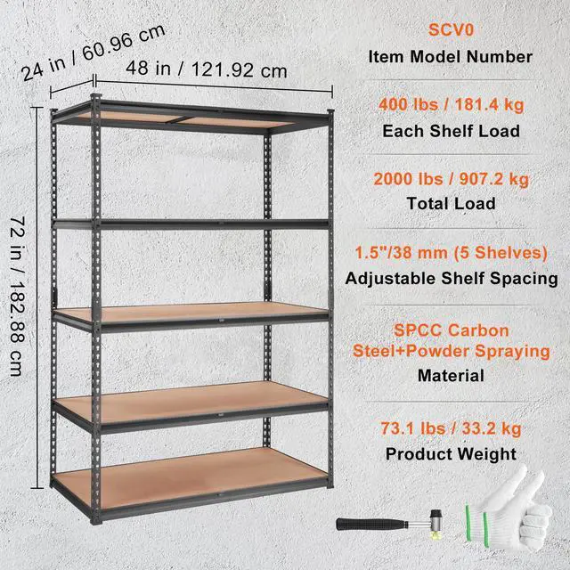 Adjustable Shelf Spacing: 1.5"/38 mm (5 Shelves),Product Size (L x W x H): 48" x 24" x 72"/121.92 x 60.96 x 182.88 cm,Item Model Number: SCV0,Product Weight: 73.1 lbs/33.2 kg,Material: SPCC Carbon Steel+MDF Boards,Total Load: 2000 lbs/907.2 kg,Each Shelf Load: 400 lbs/181.4 kg
