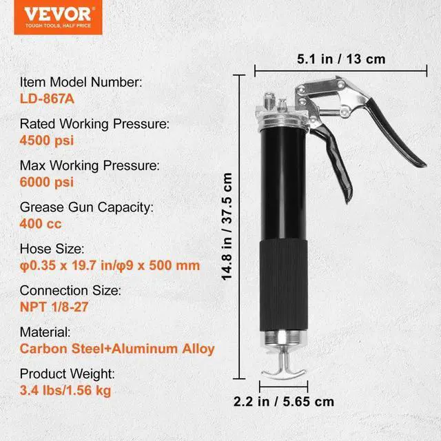 Discharge Connection: NPT 1/8,Rated Working Pressure: 4500 PSI,Hose Specification: 0.35 x 19.69 in ± 0.08 in / 9 x 500 mm ± 2 mm,Item Model Number: LD-867A,Material: Carbon Steel+Aluminum Alloy,Grease Gun Capacity: 13.53 OZ / 400 CC,Net Weight: 3.44 lbs / 1.56 kg,Max. Working Pressure: 6000 PSI,Product Size: 14.76 x 5.12 x 2.22 in ± 0.12 in / 375 x 130 x 56.5 mm ± 3 mm