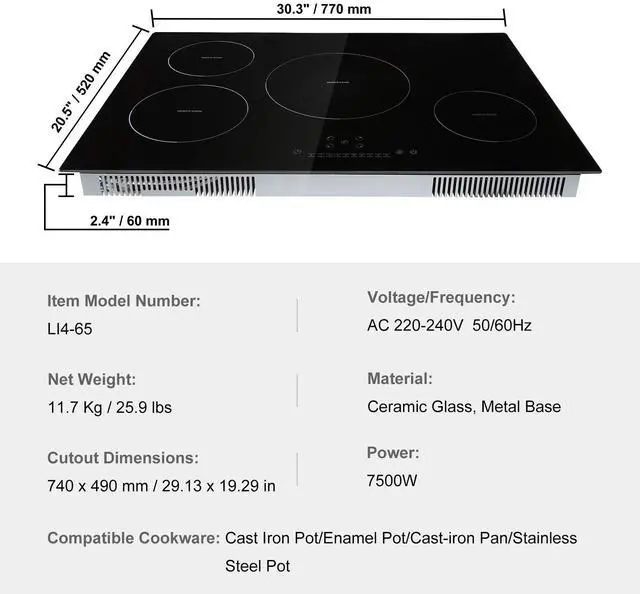 Voltage/Frequency: 220-240V, 50/60Hz,Model: LI4-65,Compatible Cookware: Cast Iron Pot, Cast Aluminum Pot, Stainless Steel Pot,Material: Tempered Glass Panel, Metal Bottom Shell,Net Weight: 11.7 Kg / 25.9 lbs,Power: 7500W