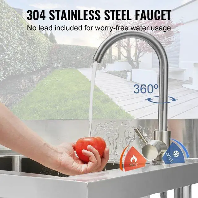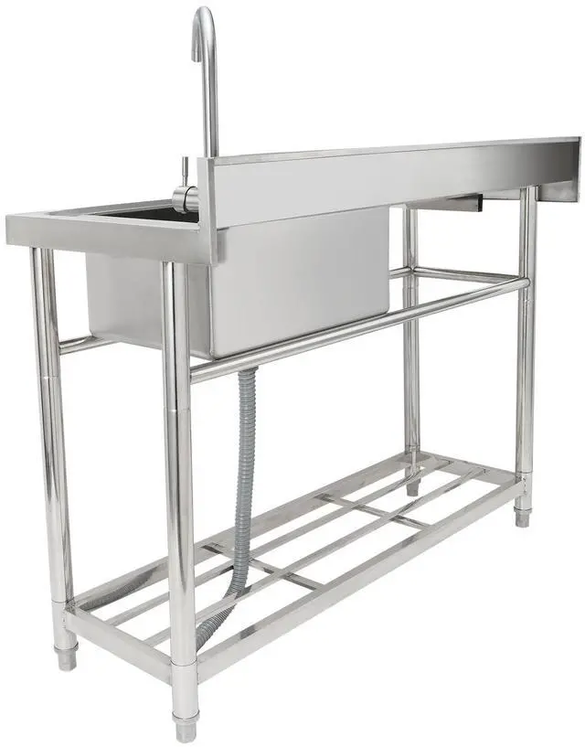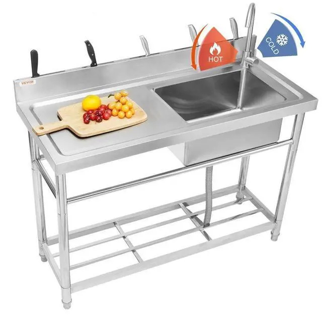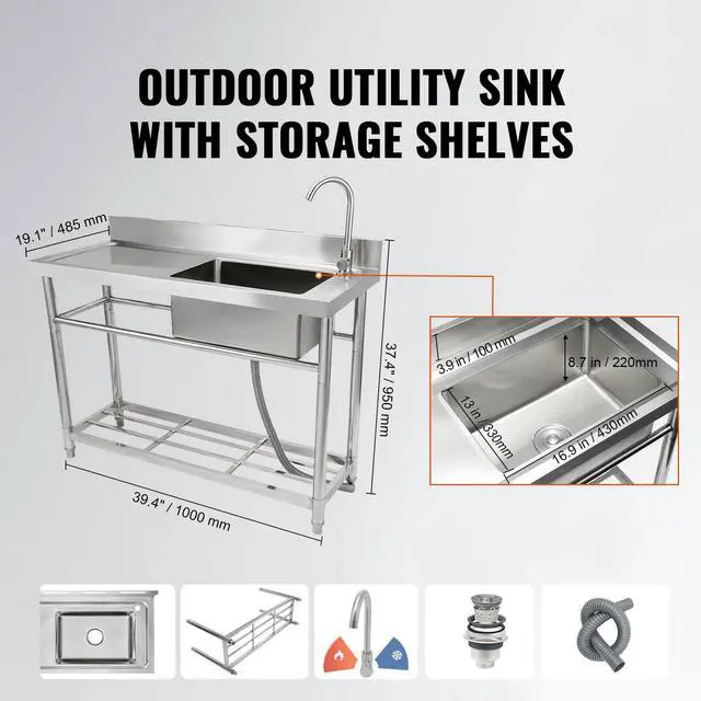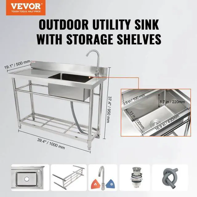 VEVOR Stainless Steel Utility Sink, Free Standing Single Bowl Commercial Kitchen Sink Set w/Workbench, 39.4 x 19.1 x 37.4 in Commercial Single Bowl Sinks for Garage, Restaurant, Laundry, NSF Certified