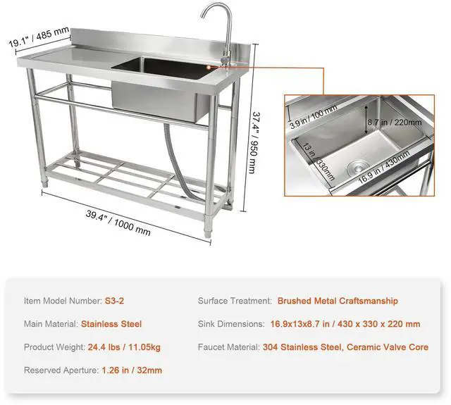 Faucet Material: 304 Stainless Steel, Ceramic Valve Core,Item Model Number: S2-2,Surface Treatment: Brushed Metal Craftsmanship,Sink Dimensions: 16.9x13x8.7 in/430 x 330 x 220 mm,Product Weight: 24.4 lbs/11.05kg,Main Material: Stainless Steel,Reserved Aperture: 1.26 in / 32mm