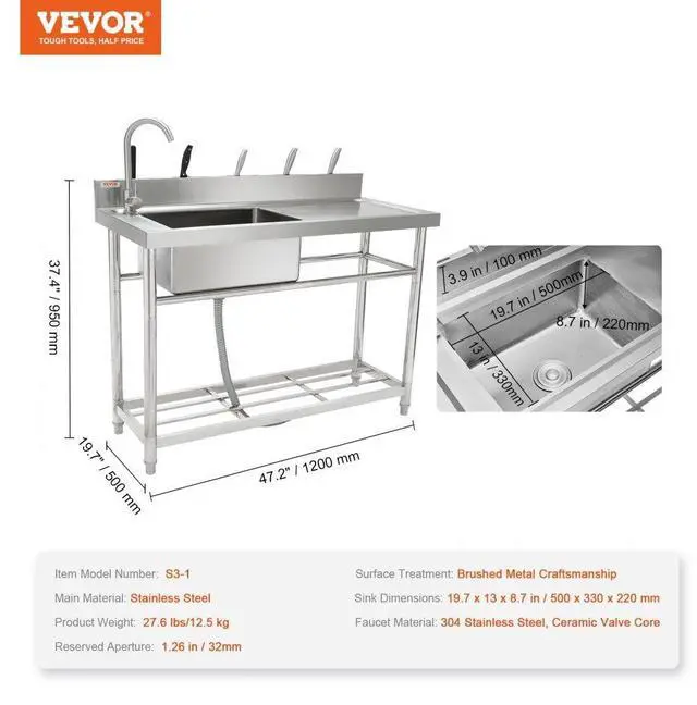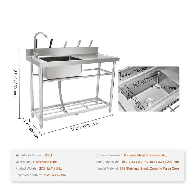 Faucet Material: 304 Stainless Steel, Ceramic Valve Core,Item Model Number: S3-1,Surface Treatment: Brushed Metal Craftsmanship,Sink Dimensions: 19.7x13x8.7 in/500 x 330 x 220 mm,Product Weight: 27.6 lbs/12.5 kg,Main Material: Stainless Steel,Reserved Aperture: 1.26 in / 32mm