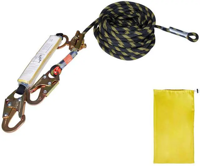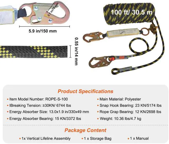 Snap Hook Bearing: 23 KN/5174 lbs,Wire Length: 100 ft/ 30.5 m,Energy Absorber Bearing: 15 KN/3372 lbs,Item Model Number: ROPE-S-100,Rope Grap Bearing: 12 KN/2698 lbs,Energy Absorber Size: 13.0x1.9 in/330x49 mm,Breaking Tension: 30KN/ 6744 lbs,Main Material: Polyester,Weight: 10.36 lbs/4.7 kg