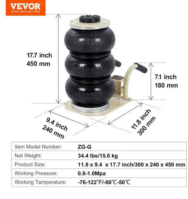 Lifting Height without Load: 5.5-17.7 inch/140 mm-450 mm,Working Pressure: 0.8-1.0Mpa,Normal Pressure Range: 8 kg/cm²,Working Temperature: -76-122/-60-50,Item Model Number: ZG-G,Net Weight: 34.4 lbs/15.6 kg,Product Size: 11.8 x 9.4 x 17.7 inch/300 x 240 x 450 mm