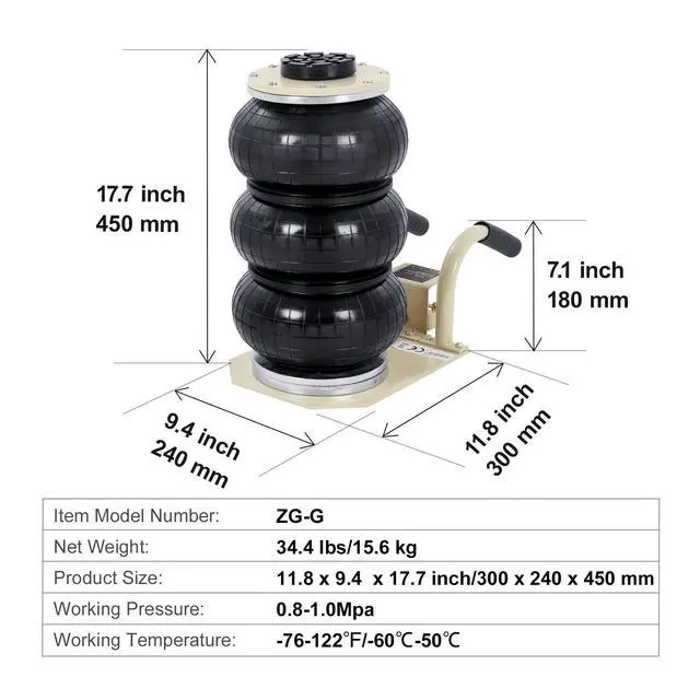 Lifting Height without Load: 5.5-17.7 inch/140 mm-450 mm,Working Pressure: 0.8-1.0Mpa,Normal Pressure Range: 8 kg/cm²,Working Temperature: -76-122/-60-50,Item Model Number: ZG-G,Net Weight: 34.4 lbs/15.6 kg,Product Size: 11.8 x 9.4 x 17.7 inch/300 x 240 x 450 mm