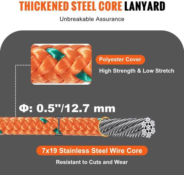 • VEVOR Steel Core flipline, 1/2" x 8' Arborist Flipline, Flip Line for Tree Climbing with Alloy Steel Snap Hook, Aluminum Alloy Carabiner and Extra Tool Lanyard, for Arborist, Tree Climbers